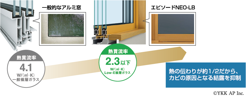外気からの熱の伝わり方を1/2にまで減らすことで、一般のアルミ窓と比較しても結露を大幅に抑制することができます。
